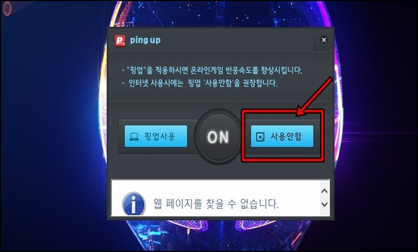위 사진처럼 OFF -> ON으로 변경되었다면 실행됐다고 보시면 돼요. 그리고 만약 게임을 종료하고 핑업을 끄고 싶을땐 위 사진속처럼 "사용 안함"을 클릭하시면 되요.
