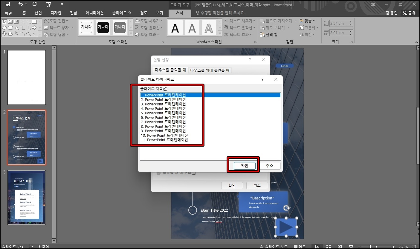 확인 버튼을 클릭하시면 완료가 되는데 이제 슬라이드 쇼를 시작해서 2번 슬라이드에서 실행 단추를 클릭해보시면 가로 슬라이드 PPT로 바로 넘어가실 거예요.