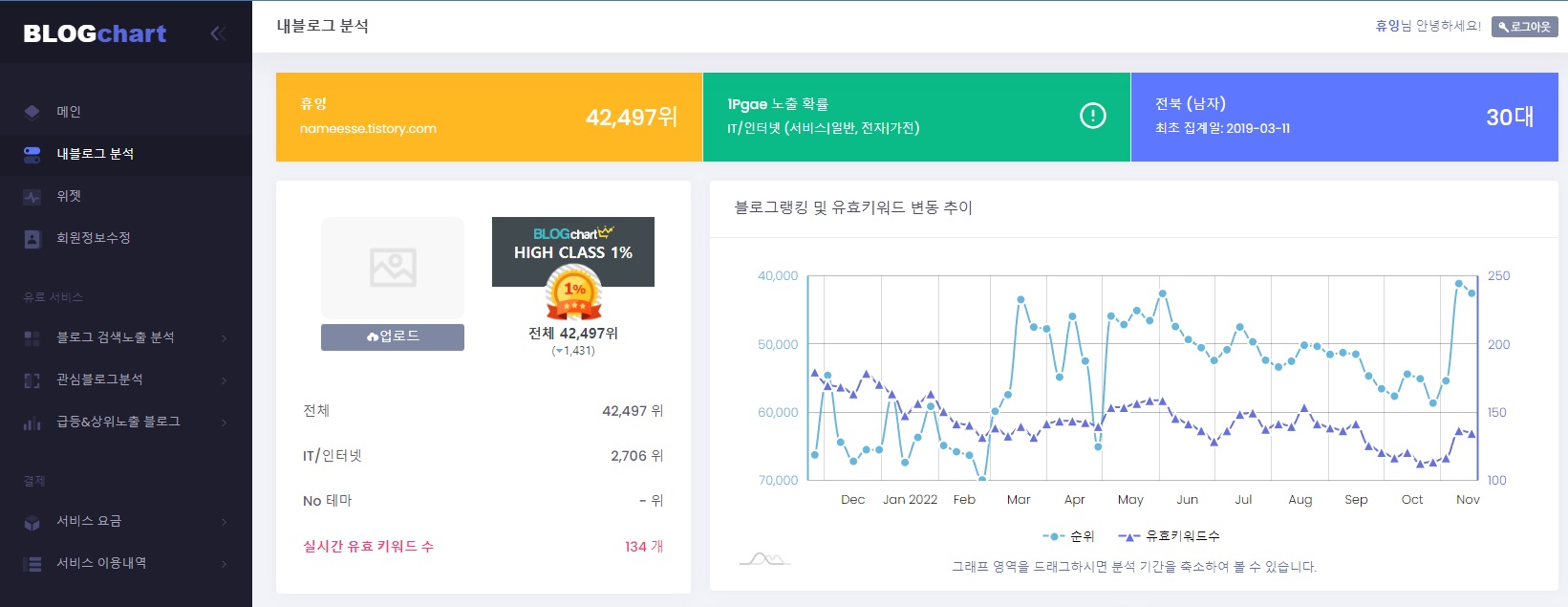 사용방법은 간단하게 회원가입을 통해 여러분의 블로그사이트 주소를 등록해주시면 위 사진처럼 전체 블로그 순위 및 랭킹 및 키워드 변동추이 등을 확인할 수 있어요. 작년에 비해 순위가 많이 떨어졌네요^^;;