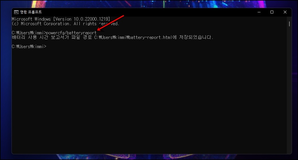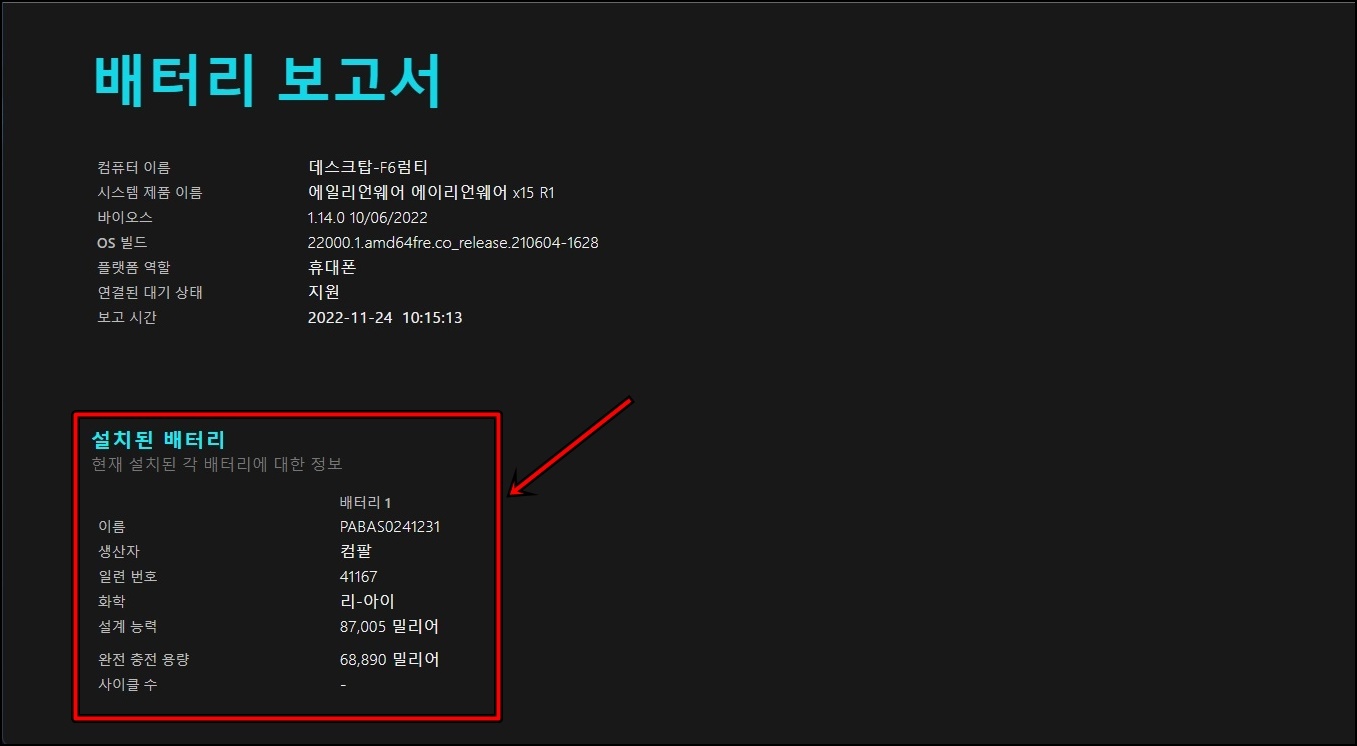 명령프롬프트 실행 후 "powercfg/batteryreport"를 이력 후 Enter를 쳐주세요.