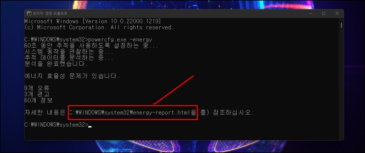 분석이 완료가 되면 "C:\WINDOWS\system32\energy-report.html"을 참조하라는 메시지가 나오는데 해당 경로를 찾아가서 파일을 찾아주세요.