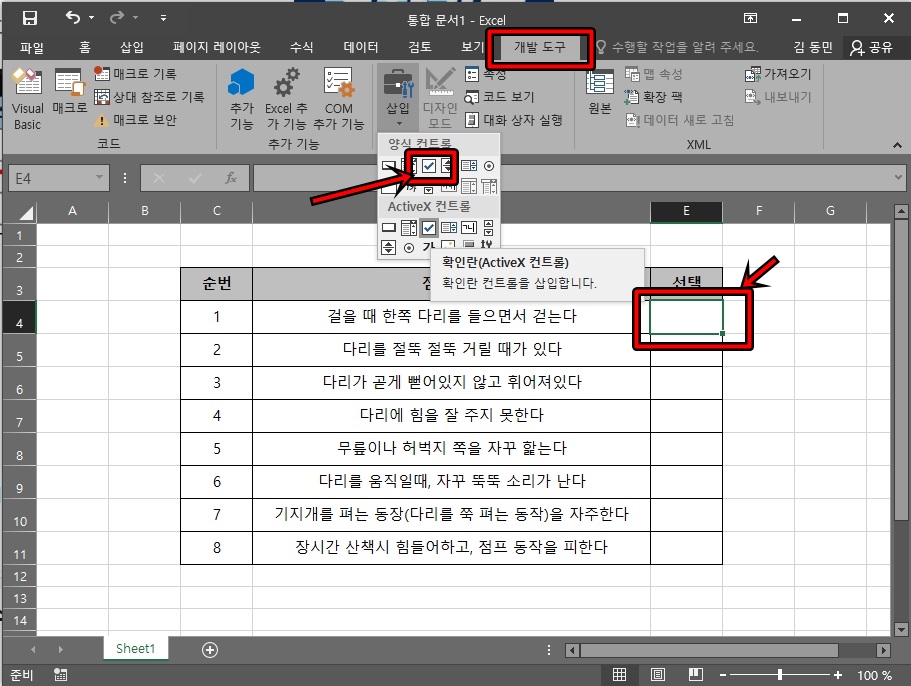자 여러분의 엑셀 상단메뉴에서 [개발도구] 탭이 활성화된 걸 확인할 수 있을 거예요. 이제 체크박스를 넣고 싶은 셀을 클릭하고 [개발도구] 클릭 후 양식컨트롤에서 체크박스 아이콘을 클릭해 주세요.