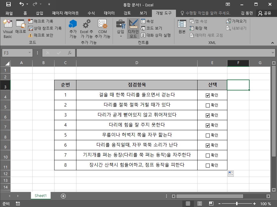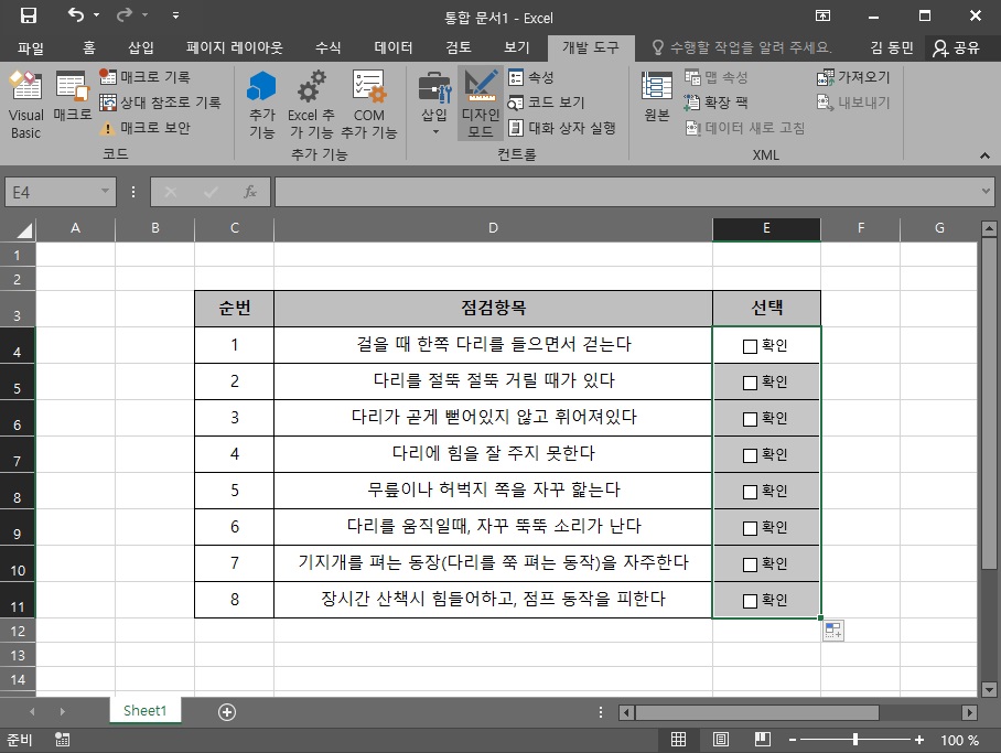 위 사진처럼 체크박스가 첨부가 되었는데 마우스 우클릭해서 이름을 편집하거나 크기, 위치등을 옮기실 수 있어요.