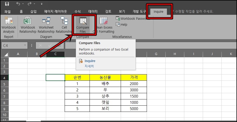 이제 엑셀 상단메뉴에 보시면 "Inquire"메뉴가 보이실 텐데 선택 후 하위 메뉴에서 "Compare Files"메뉴를 클릭해 주세요.