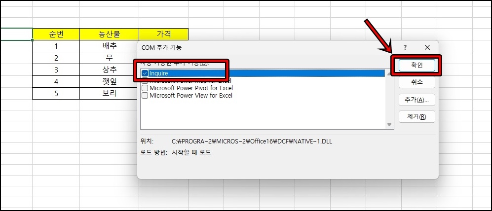 COM 추가 기능이 활성화되면 "Inquire"기능을 체크하고 [확인] 버튼을 클릭해 주세요.