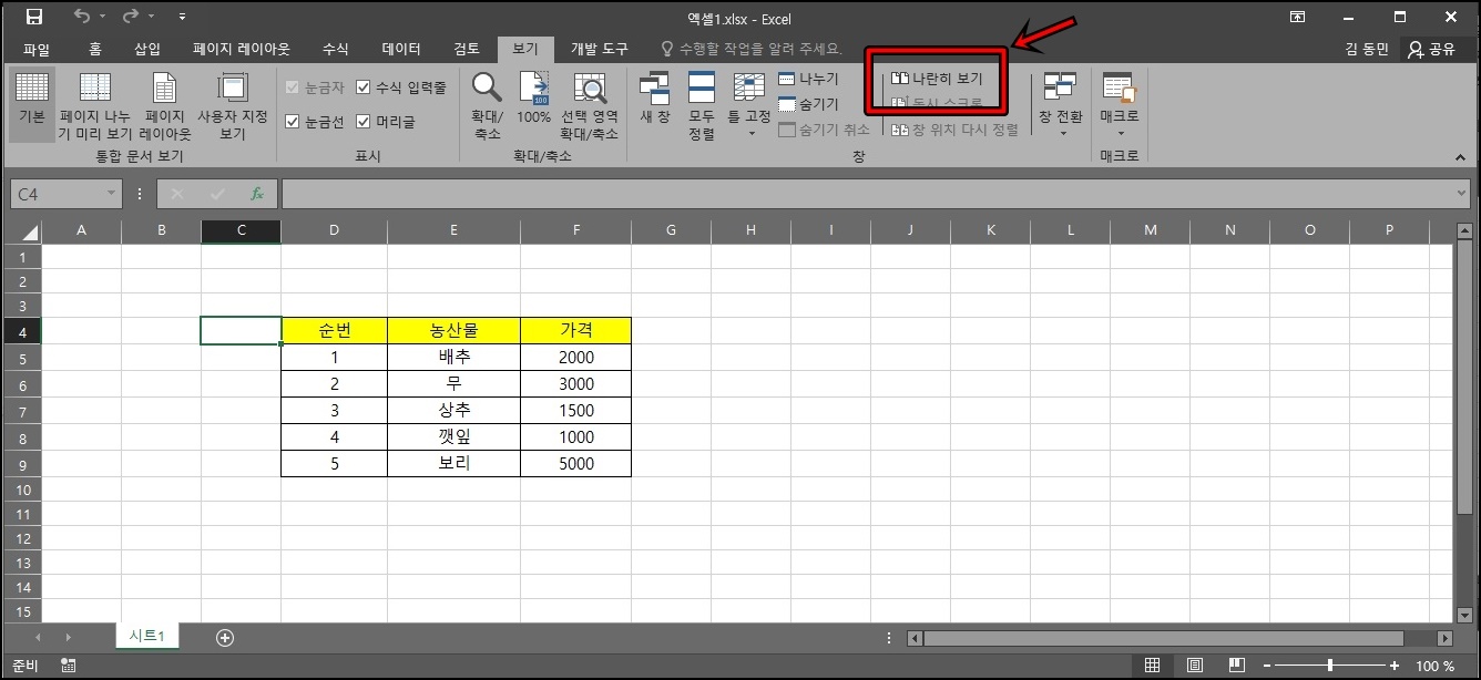 위 사진처럼 두 개의 엑셀 파일이 나란히 정렬되었어요. 마우스 스크롤을 움직이면 두 엑셀의 스크롤이 동시에 같이 움직여서 데이터가 많다면 비교하기 훨씬 편한 작업이겠죠? 나란히 장렬히 두 개까지만 되고 엑셀 파일이 3개 이상 실행된 경우 비교할 문서를 선택하라고 나오니 참고해 주세요.