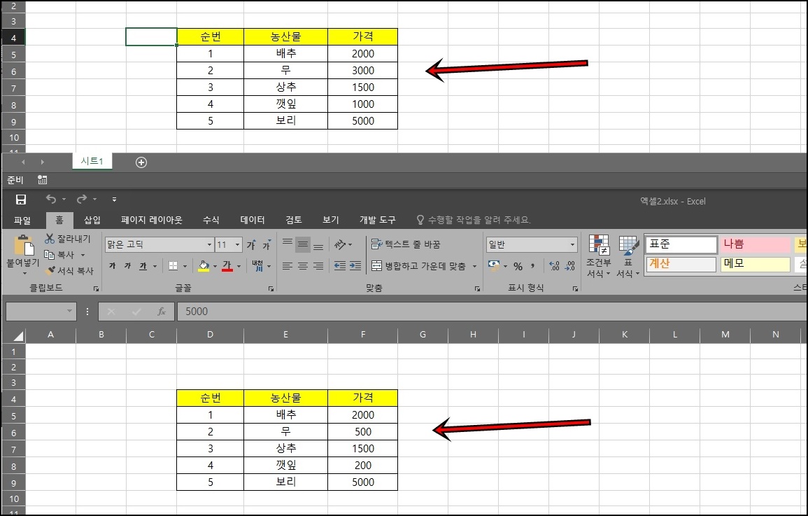자 예제를 통해 설명드릴게요. 위와 같이 양식&폼은 똑같고 데이터값만 다른 두 개의 엑셀 파일이 있다고 가정해 볼게요. 이 두 개의 파일 안에 있는 데이터를 비교하기 위해 셀을 복사하고 여간 불편한 게 아니겠죠? 이 방법을 설명드릴게요. 자 그럼 비교할 두 개의 엑셀파일을 실행해 주세요.