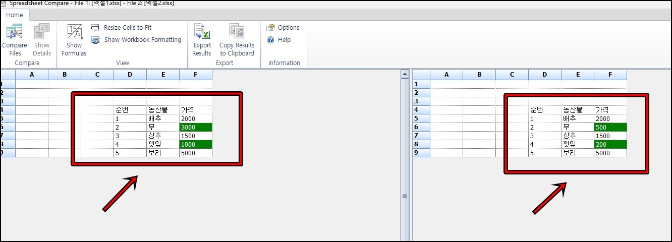 잠시뒤 위 사진과 같이 두 개의 엑셀 파일에서 데이터값이 다른 부분이 초록색으로 표시가 돼요. 정말 쉽고 간편하죠?