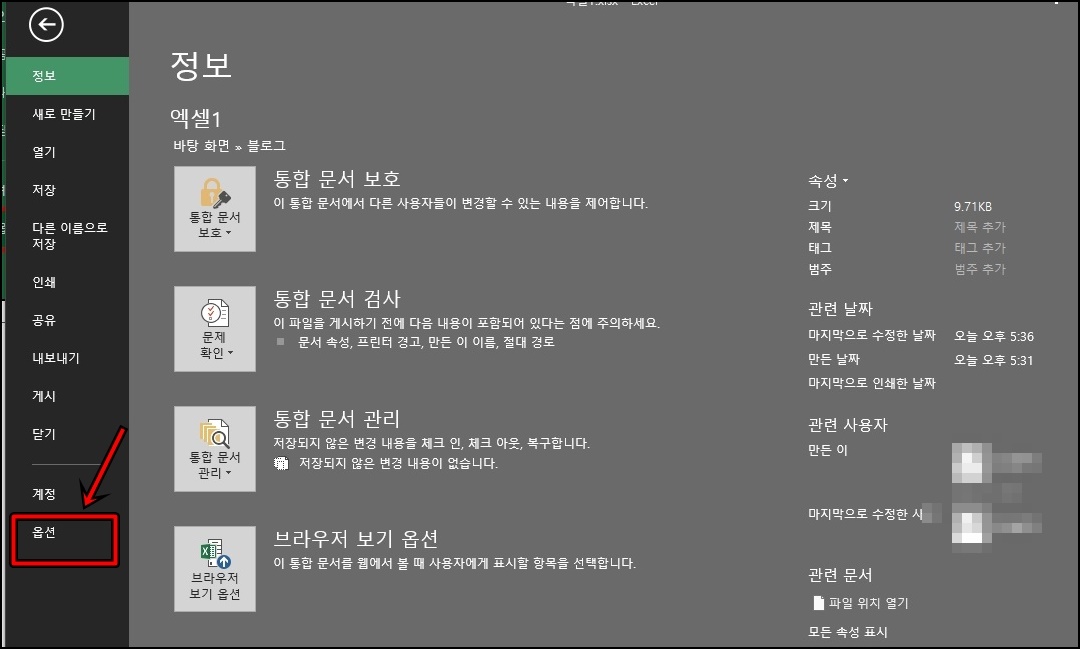 자 좀 더 확인하기 쉽게 두 개의 엑셀의 데이터값을 확인해서 차이나는 데이터/값만 표시해 주면 어떨까요? 그 방법은 엑셀 당다의 [파일] -> [옵션] 메뉴로 들어가 주세요.