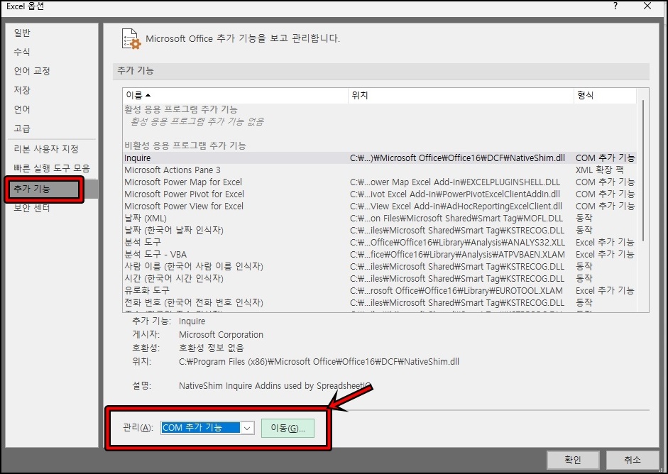 엑셀 옵션창이 활성화되면 왼쪽 메뉴에서 [추가 기능]을 클릭 후 사진과 같이 관리 부분에 [COM 추가 기능]을 선택 후 [이동] 버튼을 클릭해 주세요.