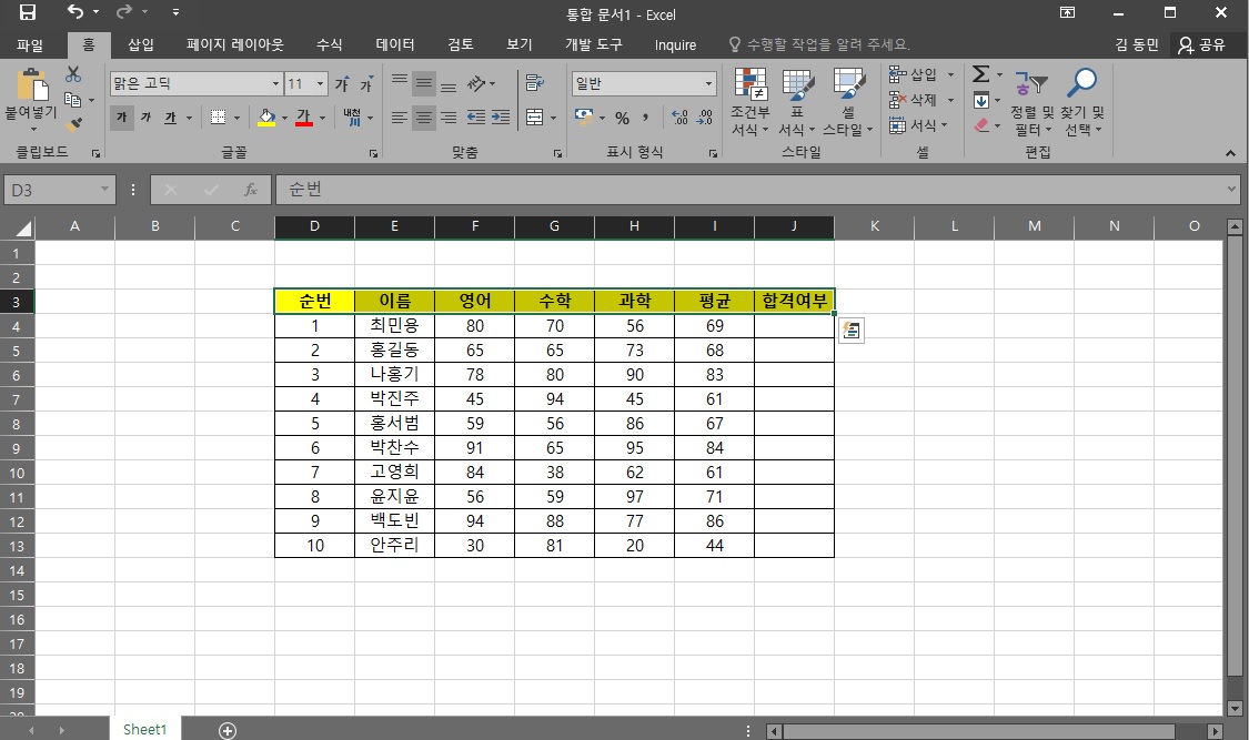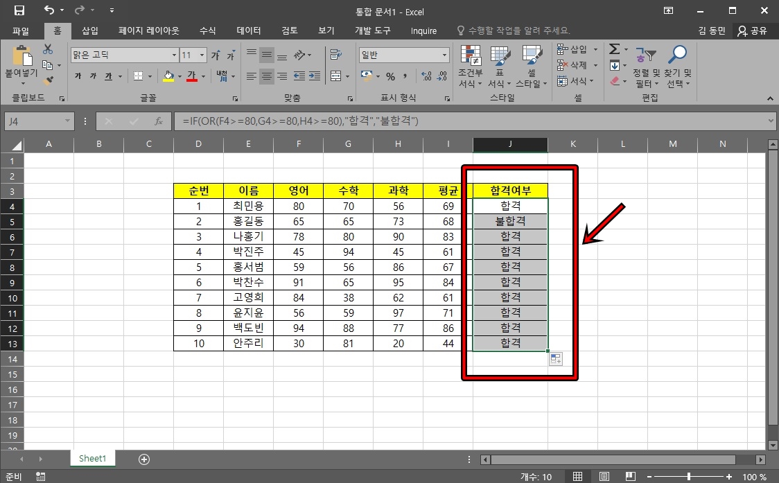 합격여부셀에 나머지 합격여부를 표시하기 위해 채우기 핸들을 이용해서 나머지 값들도 구해주시면 돼요. 정말 간단하죠?