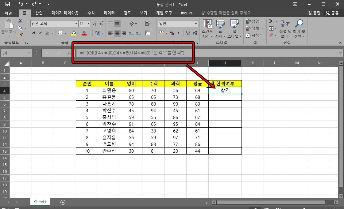 =IF(OR(F4>=80, G4>=80, H4>=80), "합격", "불합격")의 수식을 적용하면 최민용의 경우는 수학, 과학의 점수가 80점 이하이나 영어점수가 80점 이상이기에 합격으로 표시가 돼요.