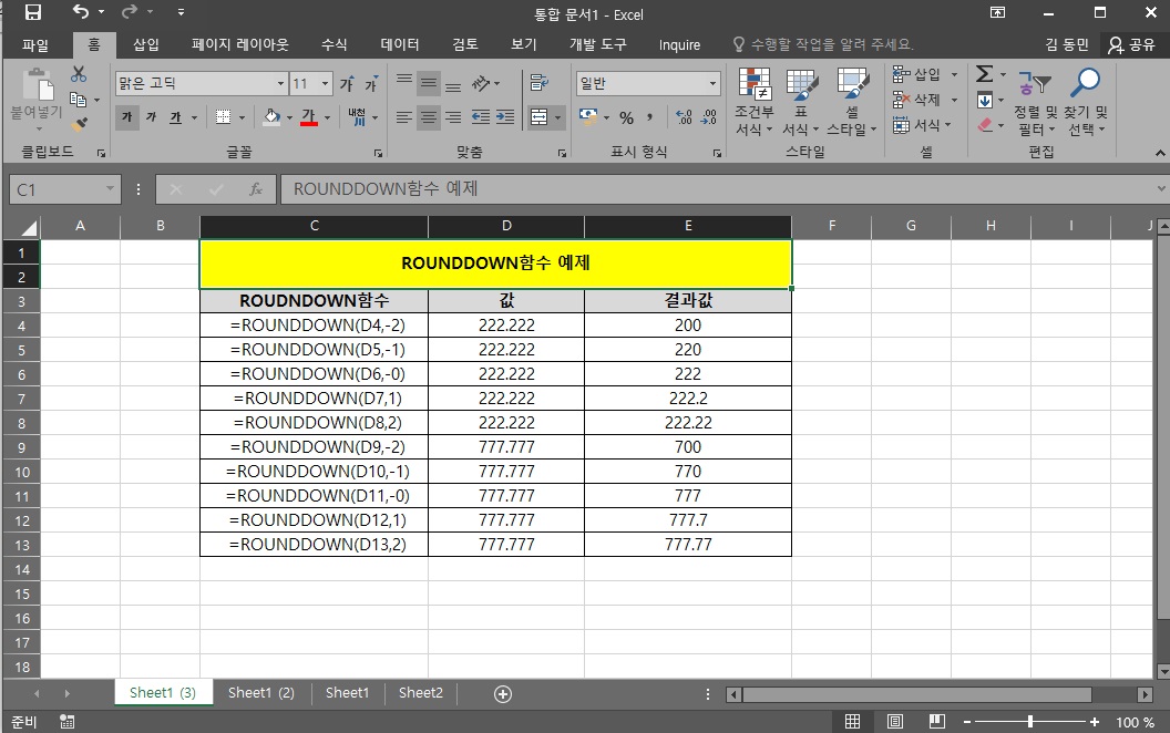 다음은 ROUNDDOWN함수예요. ROUNDDOWN함수는 무조건 내리는 함수에요.