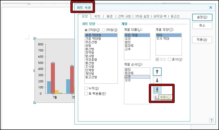 차트 속성에서는 여러 개의 데이터를 쌓을 수 있도록 설정할 수도 있어요.
