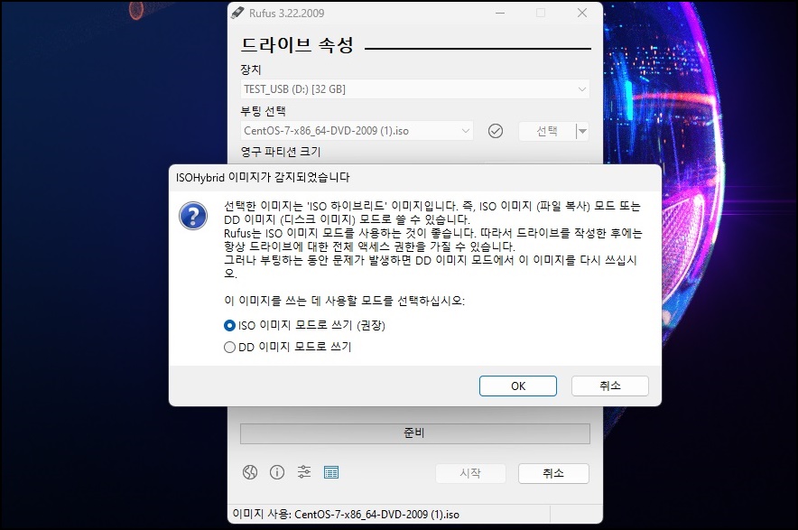 ISO 이미지 모드로 쓰기(권장)을 선택하시고 OK 버튼을 클릭해 주세요.
