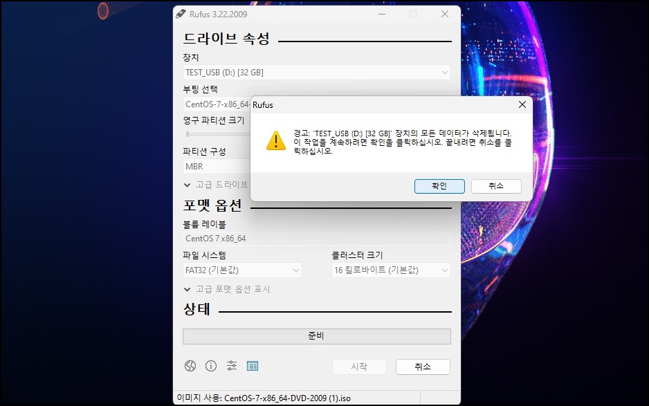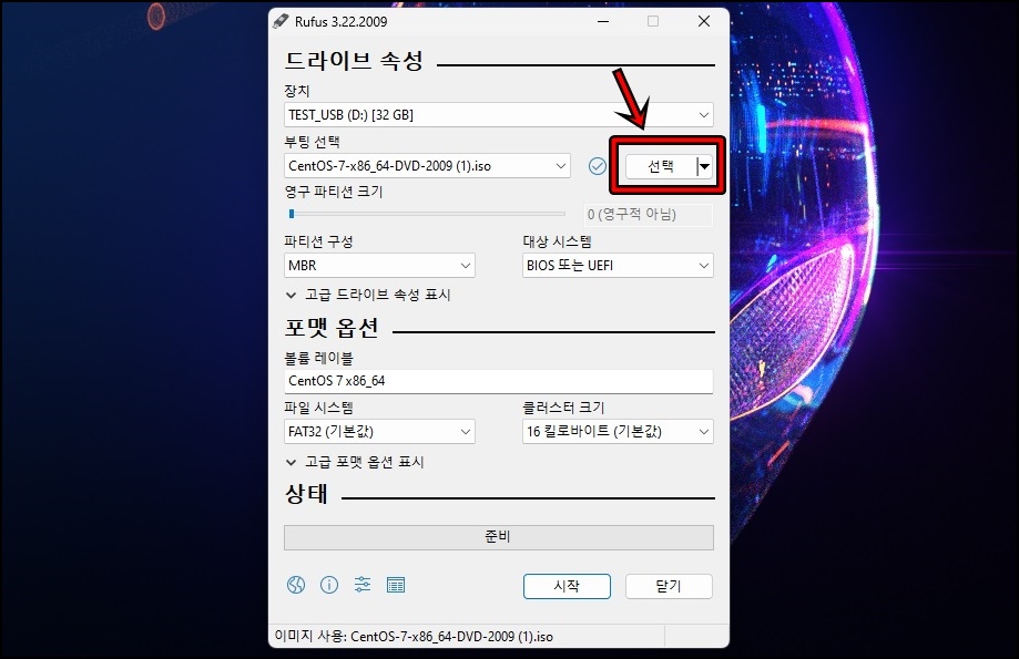 Rufus프로그램이 실행되면 위 사진처럼 선택을 클릭하여 여러분이 다운로드하신 CentOS 파일을 열어주시고 [시작] 버튼을 클릭해 주세요.