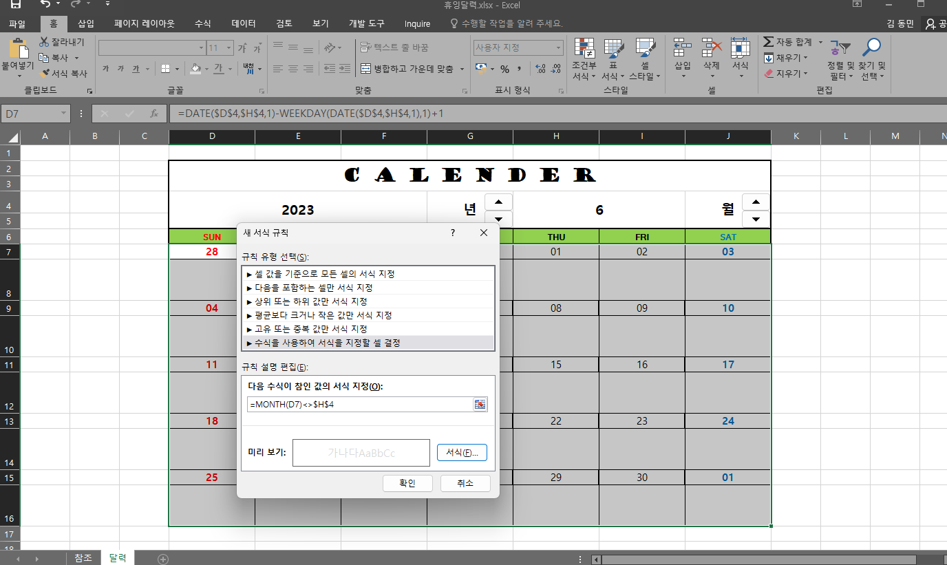서식을 입력 후 미리 보기 서식으로 들어가 해당 날짜가 아닌 날일경우 표현할 색상을 변경해 주세요.