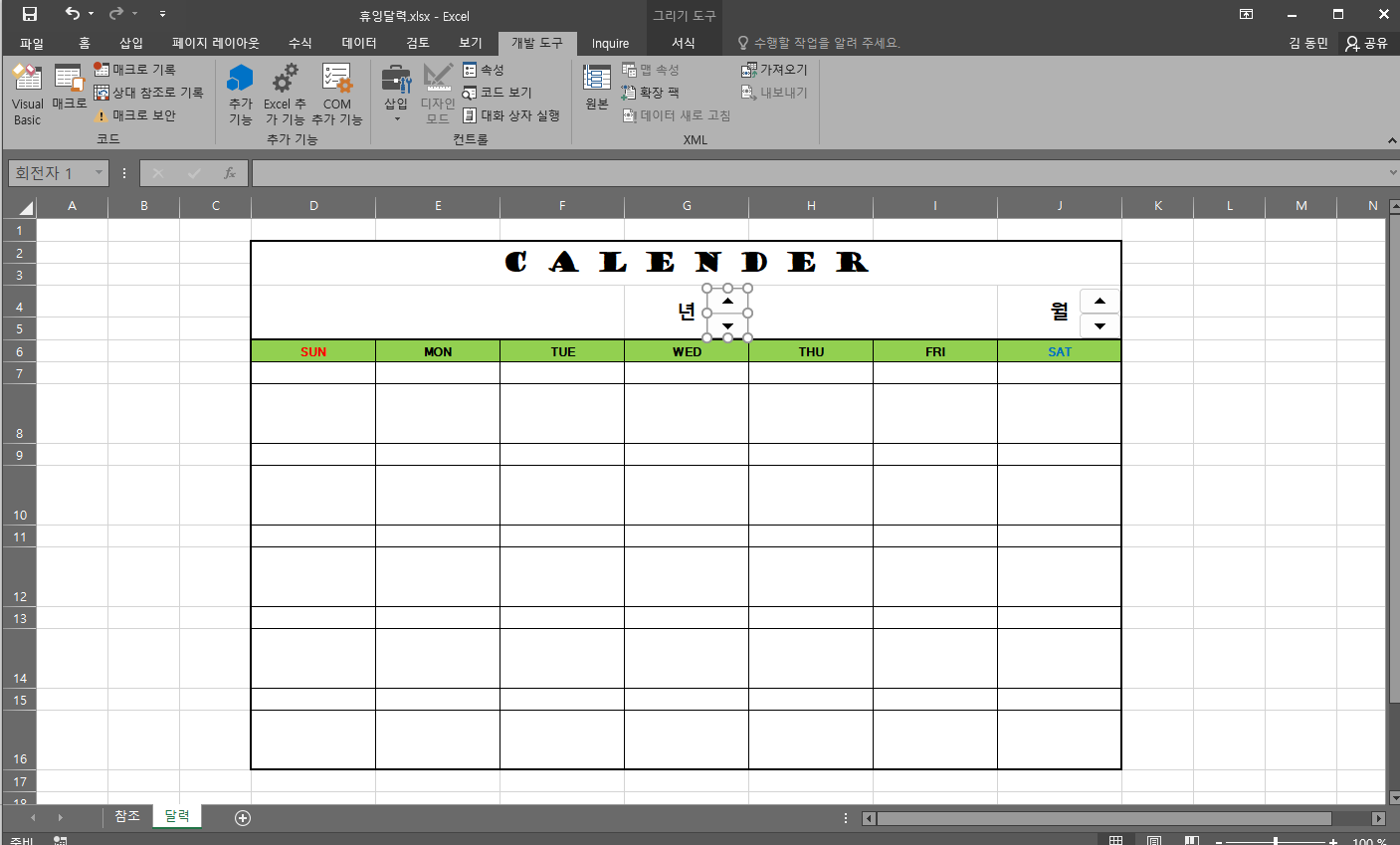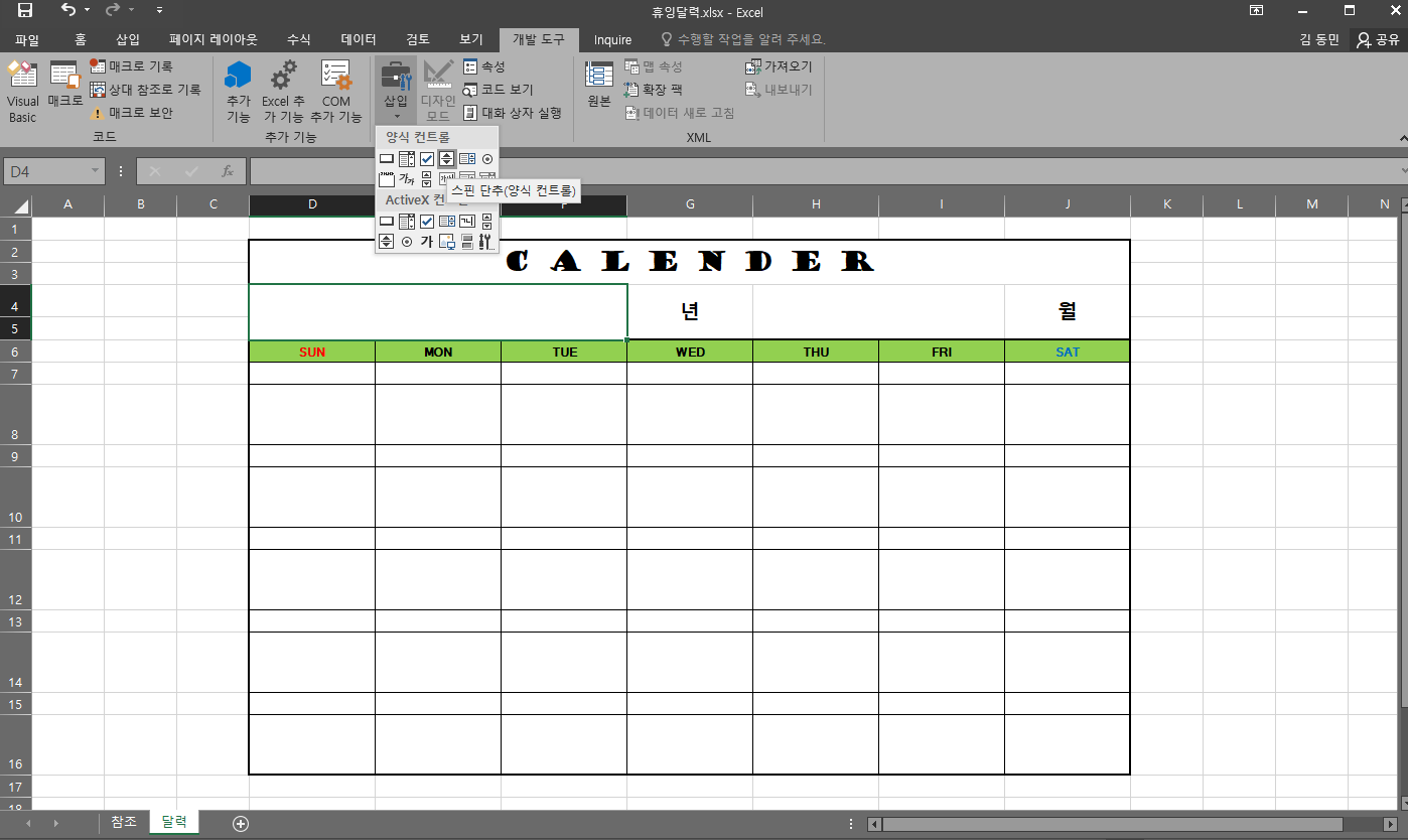 년, 월을 조정할 수 있도록 [년,월]뒤쪽으로 스핀단추를 크기에 맞게 넣어주세요.