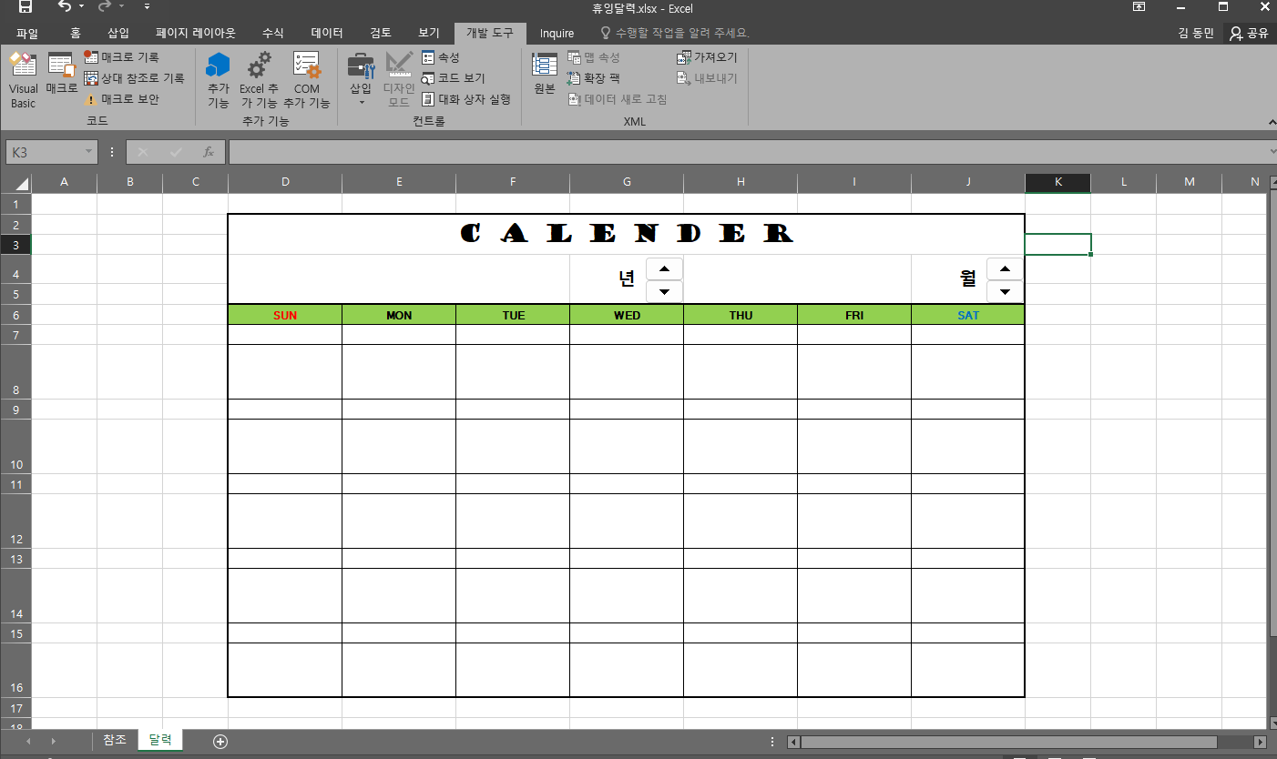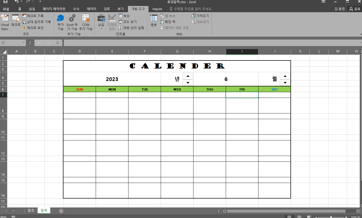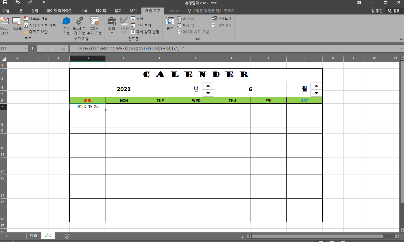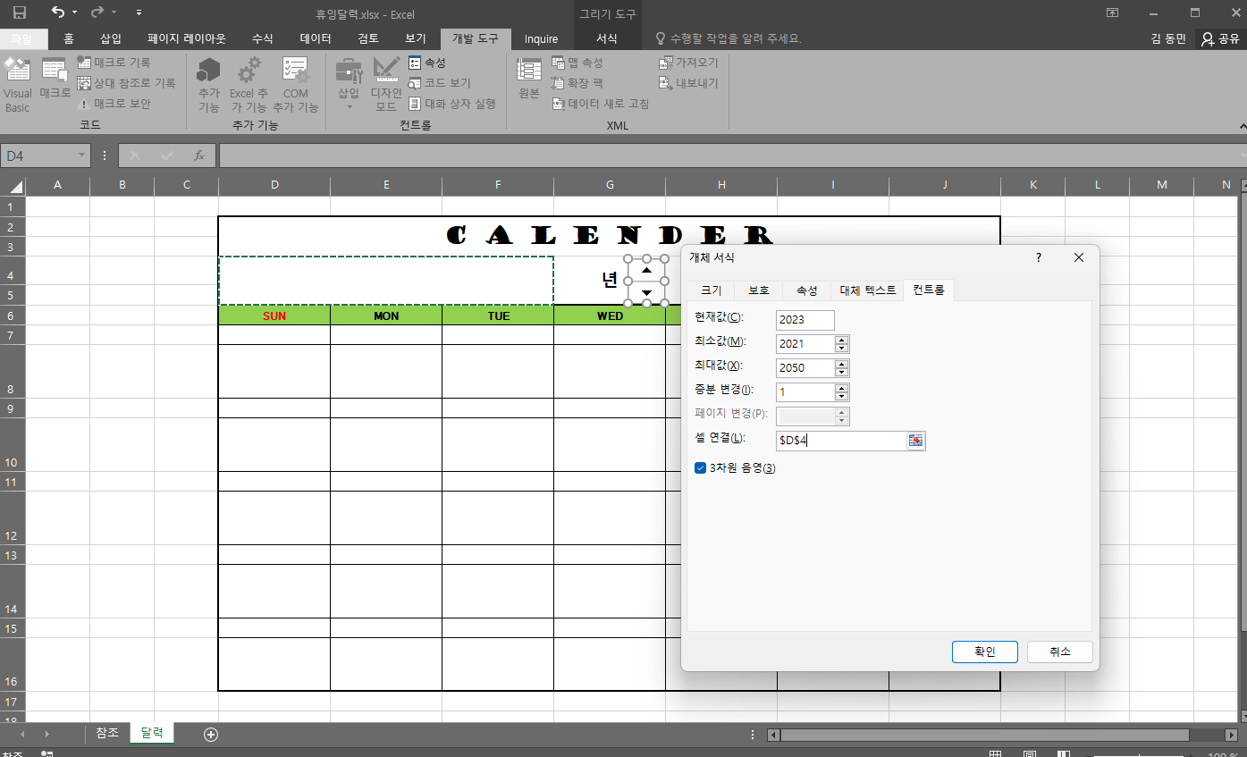 동일한 방법으로 [월] 부분도 개체 서식을 수정해 주시면 버튼을 통해 달력의 연도와 월이 변경이 돼요.