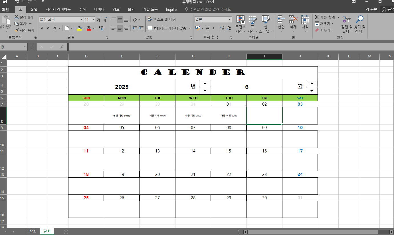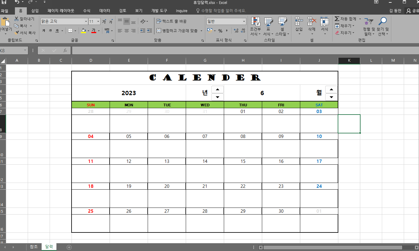 오늘은 이렇게 엑셀로 간단히 달력을 만드는 방법에 대해 알아보았는데, 지금까지 만든 예제를 첨부해 드릴 테니 필요하신 분들은 다운로드하여서 참고해 보시면 좋을 것 같아요. 오늘 포스팅이 여러분들에게 유익한 정보가 되었길 바라며 이만 마치도록 하겠습니다. 지금까지 휴잉이었습니다. 감사합니다^^.