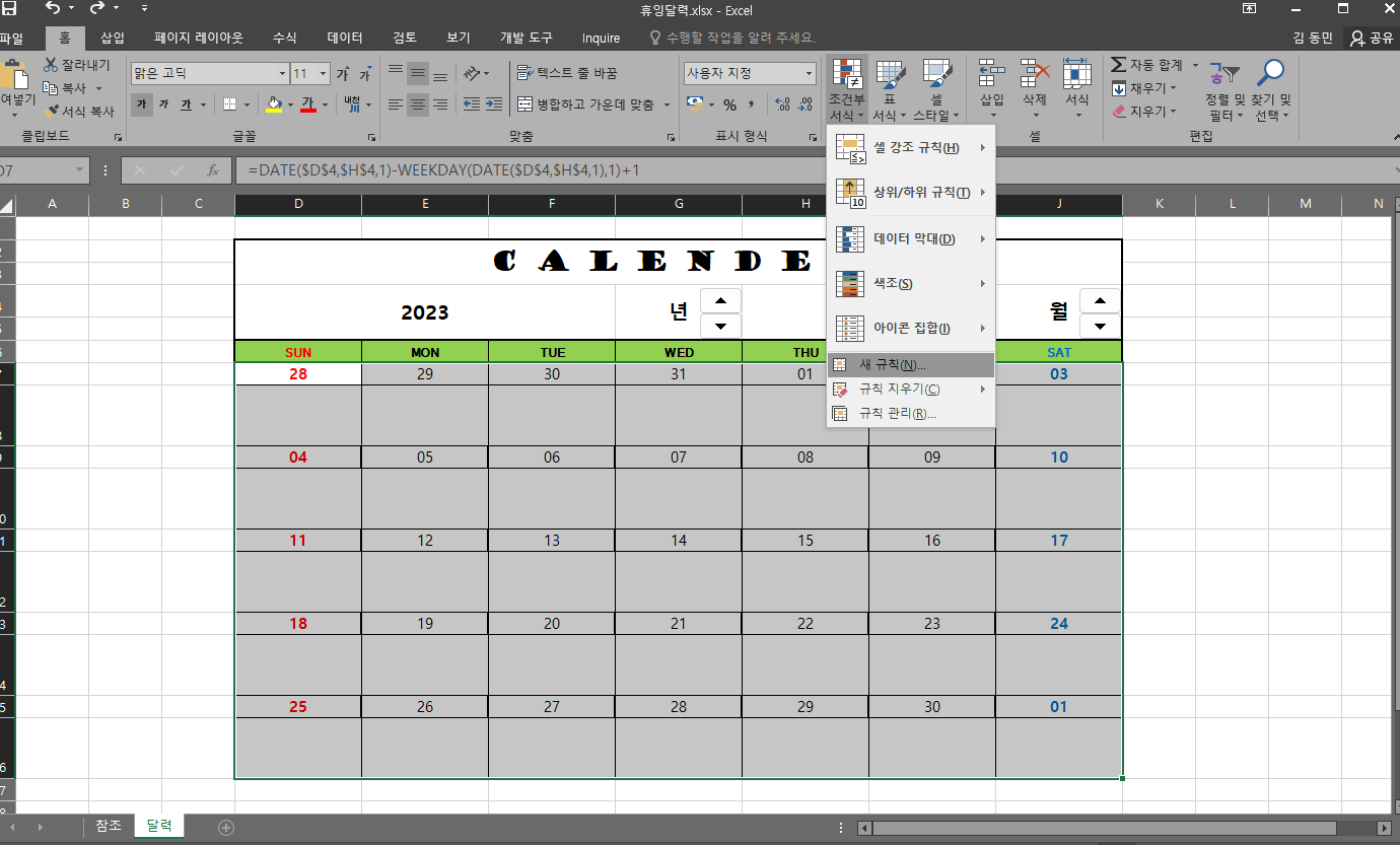 달력을 보면 6월 달력에 5월의 일자가 찍히는 걸 확인할 수 있는데 지난달의 일자는 음영처리해 보도록 할게요. 먼저 전체 달력을 범위 지정하고 상단 메뉴에서 [조건부 서식] -> [새 규칙] 메뉴를 클릭해 주세요.