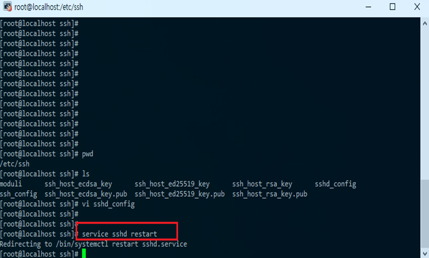 service sshd restart or systemctl restart sshd.service 명령어로 ssh 서비스를 재시작하면 설정이 정상적으로 적용이 돼요.