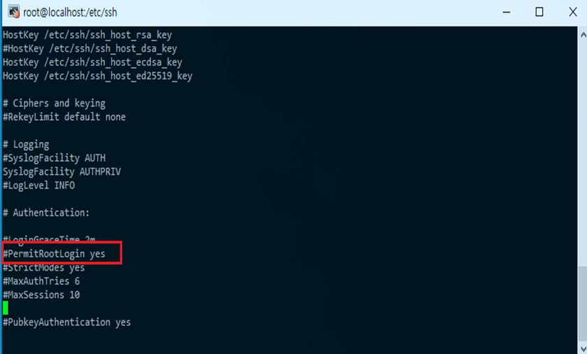 #PermitRootLogin yes이라고 되어 있을 텐데 이 부분을 찾아주세요.