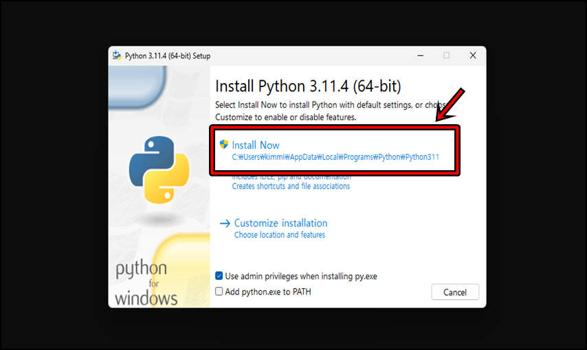위 사진과 같이 파이썬 홈페이지 접속하시면 "Download Python 3.11.4"버전을 다운로드할 수 있어요. 다운로드 버튼을 클릭해서 다운로드 후 파일을 실행해 주세요.