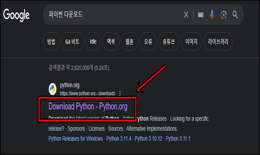다운로드 및 설치방법은 매우 간다해요. 구글 검색창에 "파이썬 다운로드"를 검색하셔서 위 사진과 같이 파이썬 홈페이지로 이동을 해주세요.