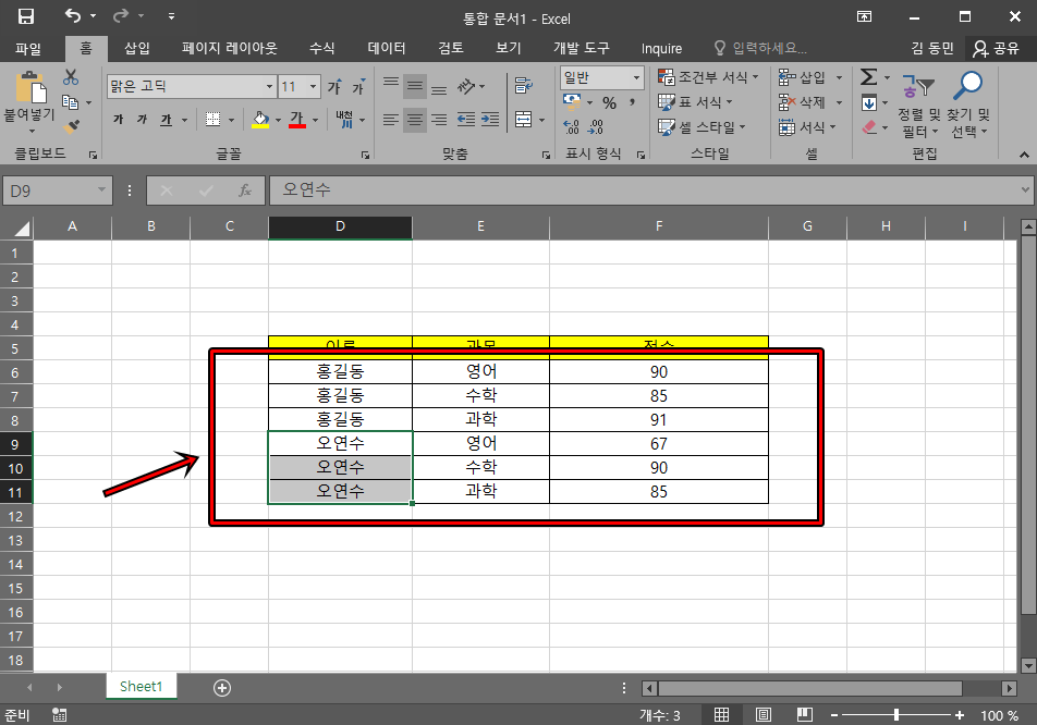 짜잔!! 박찬수가 들어간 셀의 행이 삭제가 되었어요. 참 쉽죠? 데이터의 양이 많을수록 시간도 절약되고 노동의 피로도 줄어들겠죠?^^ 오늘은 이렇게 간단하게 엑셀에서 특정 문자가 들어간 행, 열을 삭제하는 방법에 대해 알아보았는데, 오늘 포스팅으로 인해 여러분들의 엑셀 작업 속도 능률이 올라갔으면 좋겠어요. 그럼 지금까지 휴잉이었습니다.