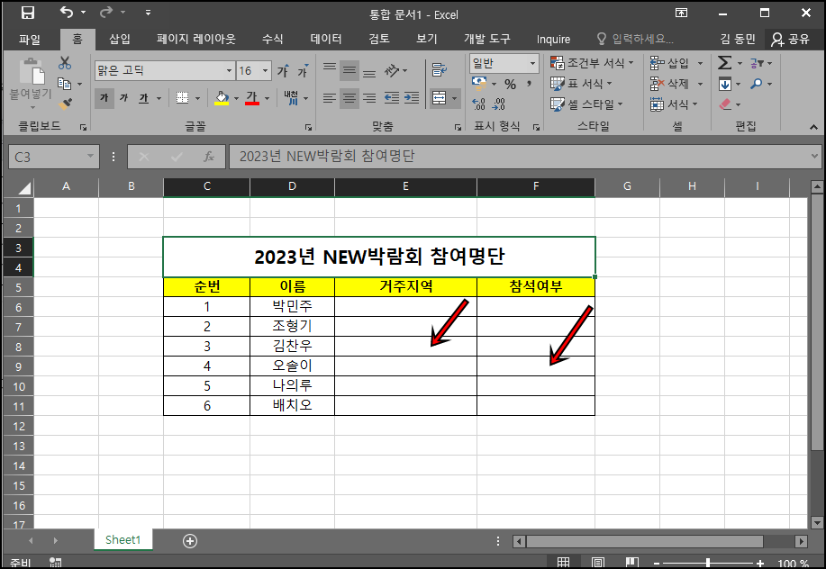 위와 같은 박람회 참여자들의 거주지역과 참석여부등을 조사한다고 가정해 볼게요. 각각의 인원에게 엑셀 파일을 보내어 작성하라고 하면 되겠지만 타이핑하기도 귀찮은 분들을 위해 간단하게 선택박스를 클릭해서 선택할 수 있도록 유도할 수 있어요.