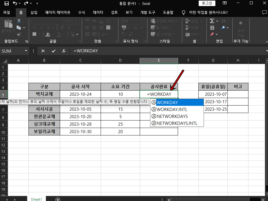 =WORKDAY(C5, D5, G5:G7)가 되겠죠? 만약 다른 셀의 공사시작도 휴일(제외할 날짜)이 동일하다면 G5:G7 범위 드래그하여 F4를 키를 눌러 고정해 주세요.