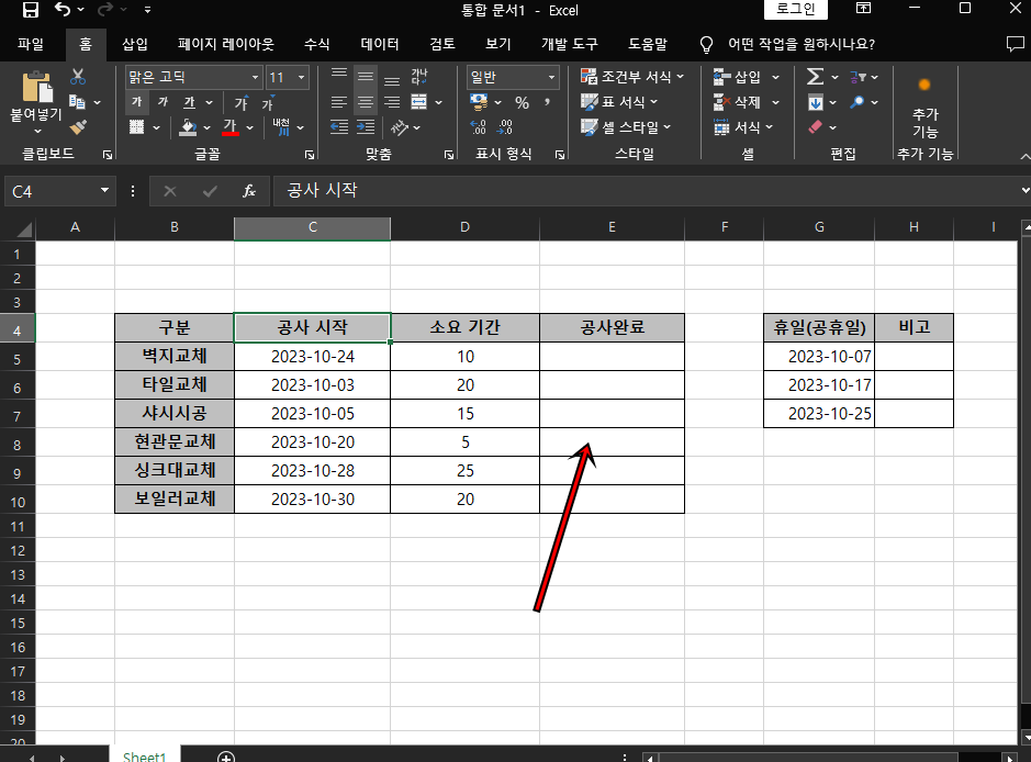 첫 번째 셀이 적용되면 채우기 핸들을 이용하여 나머지 셀들도 적용해 주시면 공사완료 날짜 계산이 완료가 돼요. 참 쉽죠?