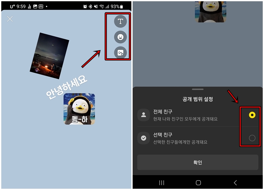 청 만들기를 하면 텍스트, 이모티콘, 사진 등을 첨부하여 나만의 스토리를 만들 수 있어요. 카카오톡 전체공개도 할 수 있고 보여주고 싶은 친구에게만 보여줄 수도 있어요.