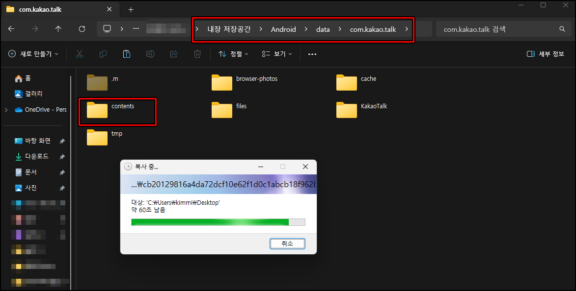 스마트폰에서 Android -> data -> com.kakao.talk 폴더로 접속하신 뒤 "contents"폴더를 바탕화면에 복사해 주세요.