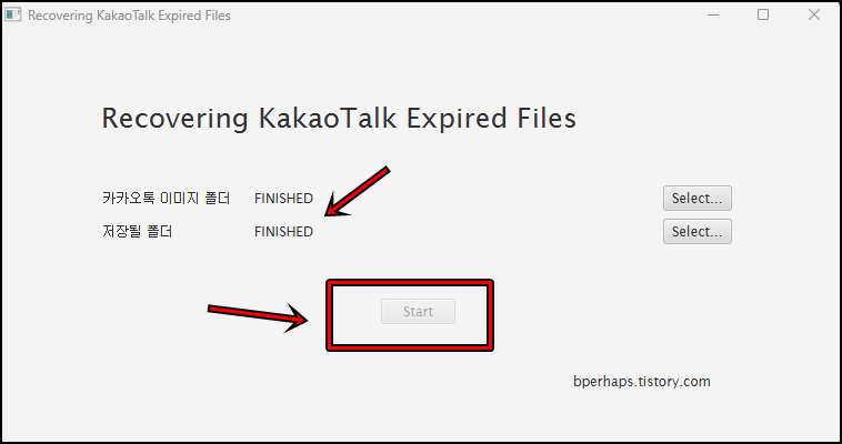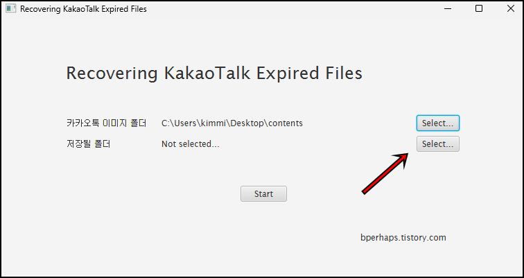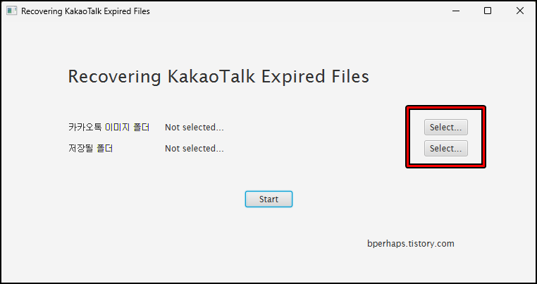 JAVA가 설치되었다면 다시 kakao.exe를 실행하면 위 사진처럼 "Recovering kakaotalk expired files"를 확인하실 수 있었어요. 카카오톡 이미지 폴더 "Select"버튼을 클릭해 주세요.
