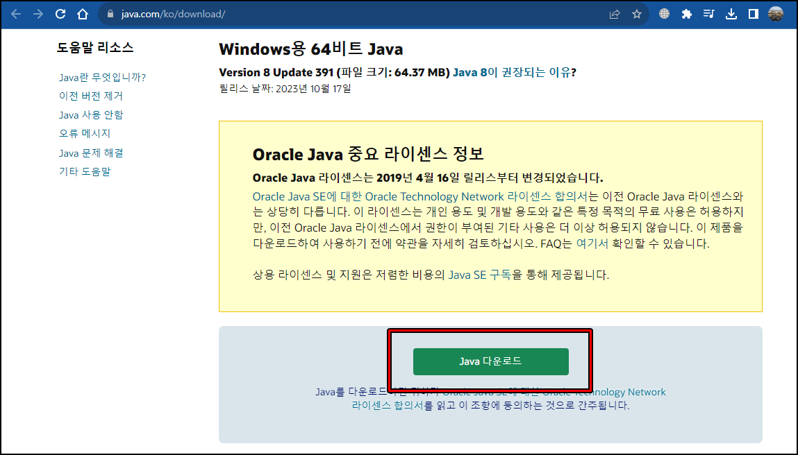 해당프로그램은 JAVA가 설치되어야 하는데 설치가 안된 PC는 다운로드 페이지로 넘어가게 돼요. JAVA 다운로드를 클릭하여 설치를 진행해 주세요.