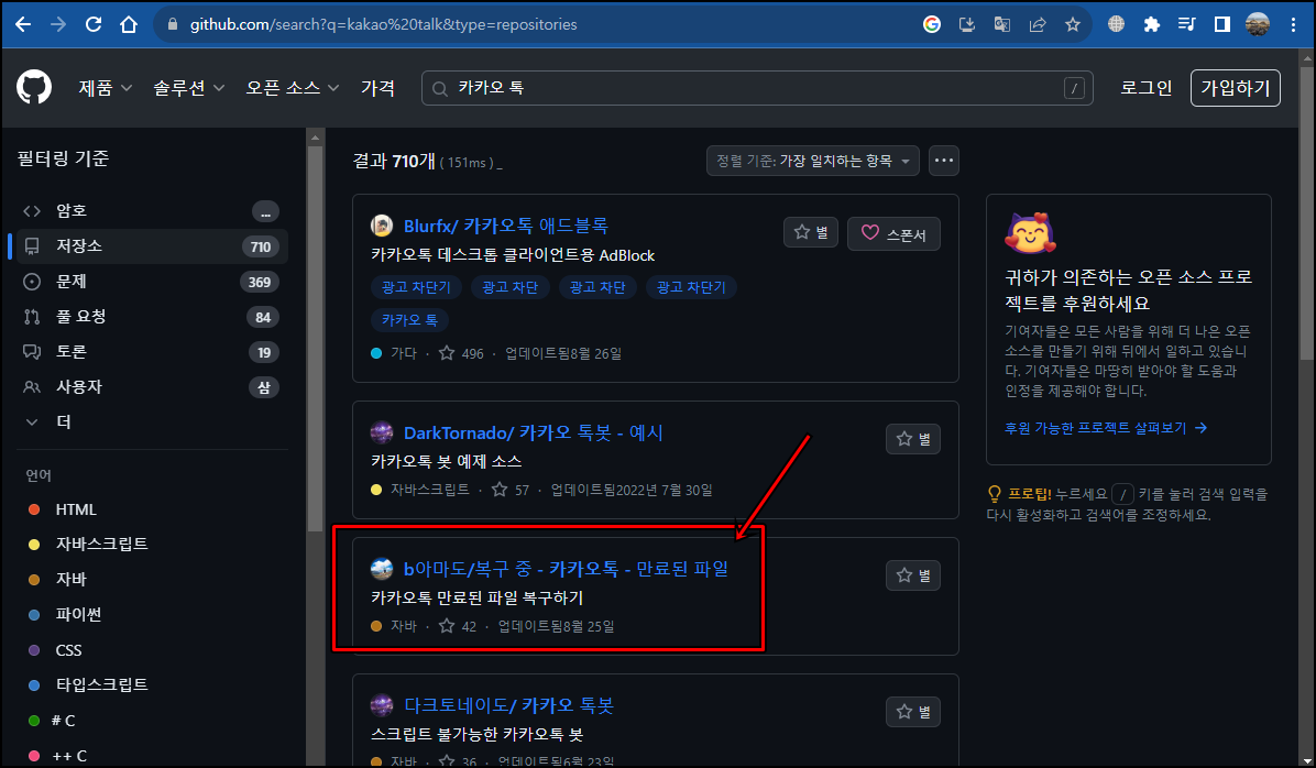 깃허브에 접속하셨다면 해당 홈페이지에서 검색창에 "카카오 톡"이라고 검색해주세요.