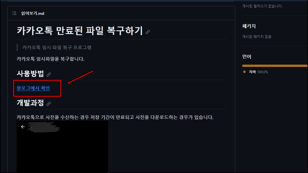 다시 깃허브 페이지로 넘어와서 페이지 중간쯤에 "블로그에서 확인"버튼을 클릭해 주세요.