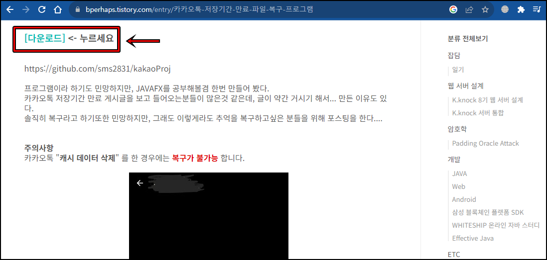"카카오 톡"이라고 검색하시면 위 사진처럼 "카카오톡 만료된 파일 복구하기"글을 확인하실 수 있을 텐데 선택해서 우선 들어가 주세요.