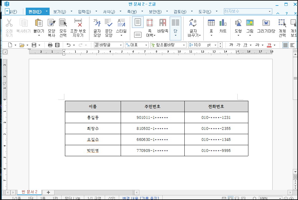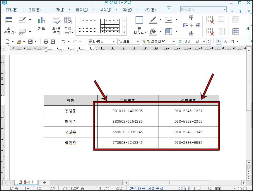 자 그럼 한글에서 개인정보가 들어있는 문서를 어떻게하면 숨기고 암호화할 수 있는 위 예제를 통해 설명드릴게요. 위 예제를 보시면 간단하게 사람이름 와 주민번호, 전화번호를 확인하실 수가 있어요. 임의로 만든 예시이지만 실제 이름과 정확한 주민번호, 전화번호일 경우 해커들에 노출되었을 때 아주 위험하겠죠? 저 개인정보 부분을 암호화처리 해보도록 할게요.