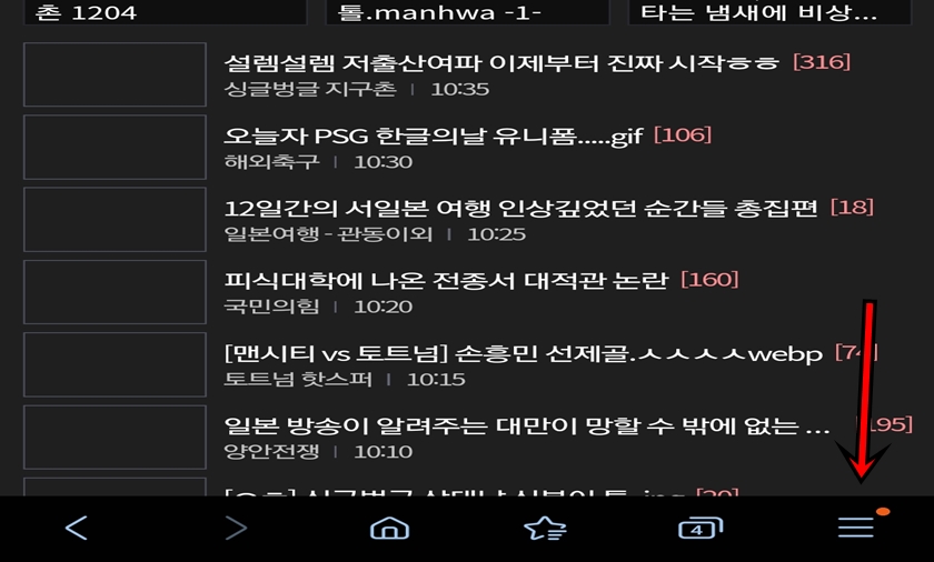 예를 들어 여러분들이 디씨인사이드를 자주 접속한다고 가정해볼게요. 매번 접속할때마다 브라우저에서 검색을 통해 접속을 하셔야하는 불편함이 있죠. 하지만 아주 간단한 방법으로 즐겨찾기같은 웹사이트 바로가기앱을 만들어놓으면 클릭한번으로 이동이 가능해요. 방법은 사진과 같이 오른쪽 하단의 [메뉴]버튼을 클릭해주세요.