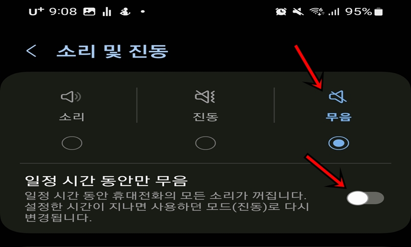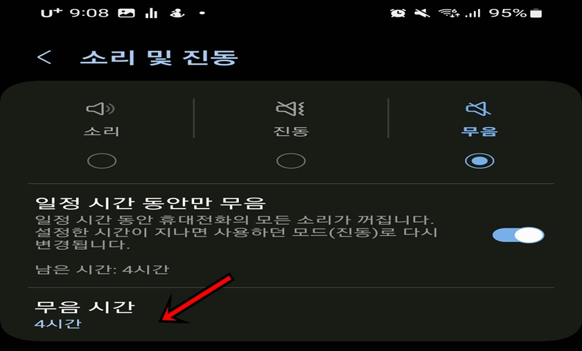 [무음]으로 선택하시면 하단의 "일정 시간 동안만 무음"이 비활성화 되어 있을 텐데, 선택해서 활성화해주세요.