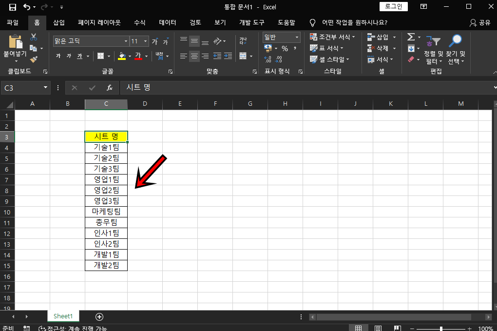먼저 위와 같이 여러개의 부서들에 대한 시트를 각각 만들어야 한다고 가정해 볼게요. 부서 수가 많지가 않아 수작업으로 해도 상관없겠지만 만들어야 할 개수가 많다면 지금 이 방법을 따라 해 보시면 좋을 것 같아요.