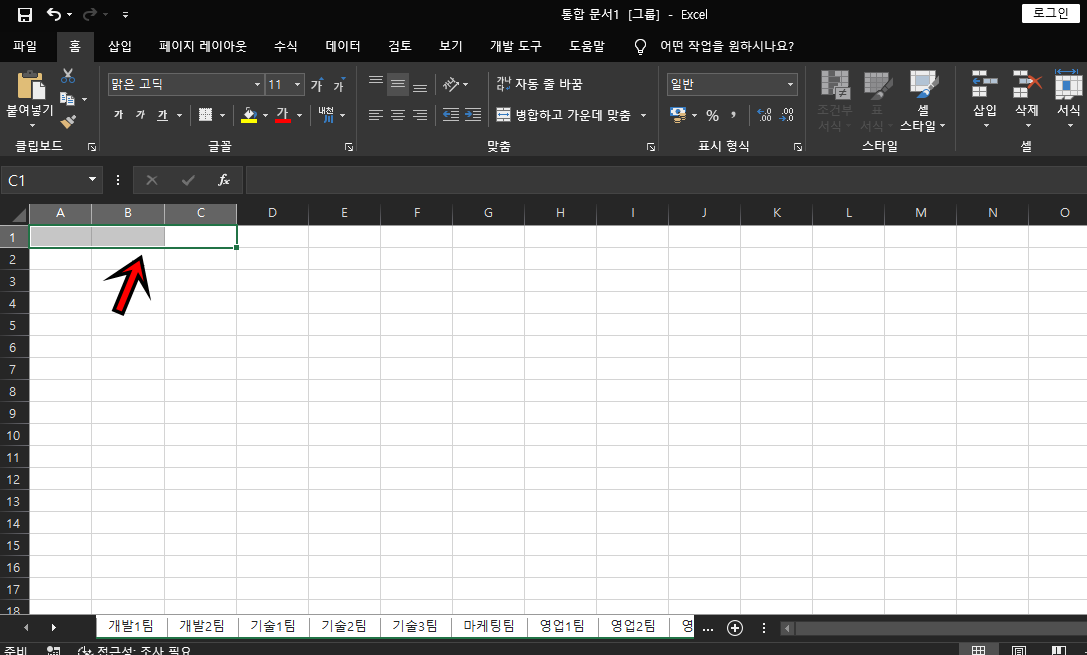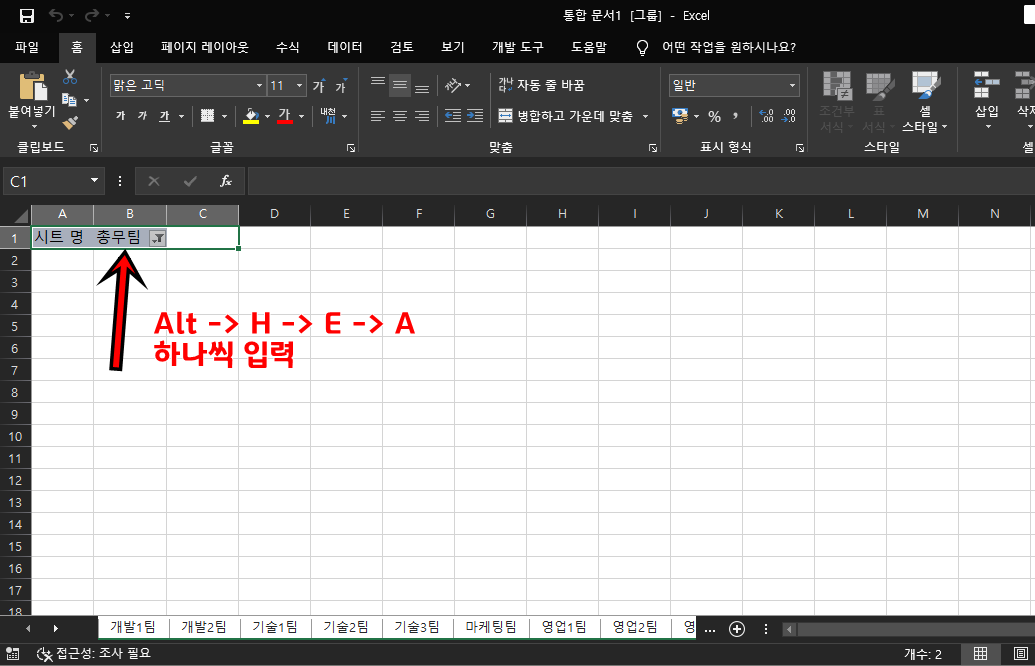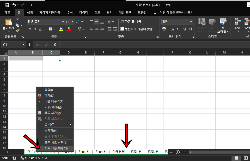 Shit + 마우스 클릭 버튼을 통해 전체 시트를 그룹화해주세요.