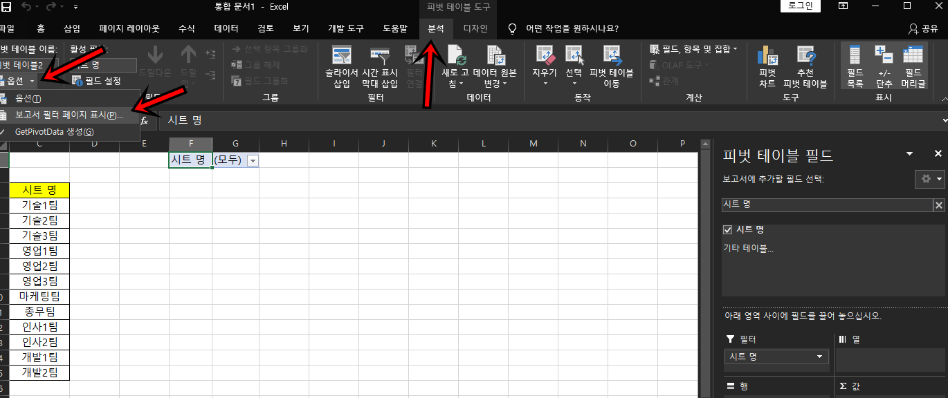 자 이제 상단의 분석 탭을 클릭 후 [옵션] -> [보고서 필터 페이지 표시] 메뉴로 들어가 주세요.