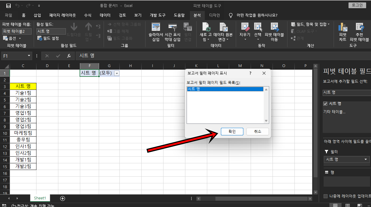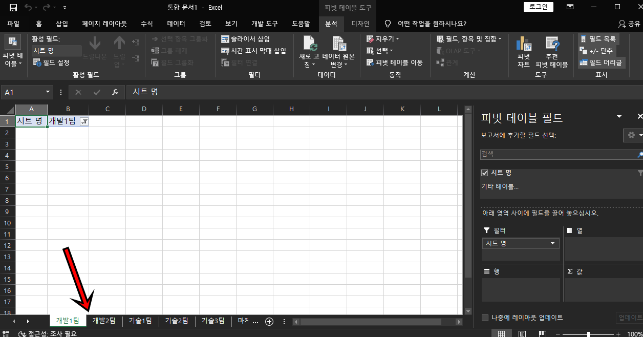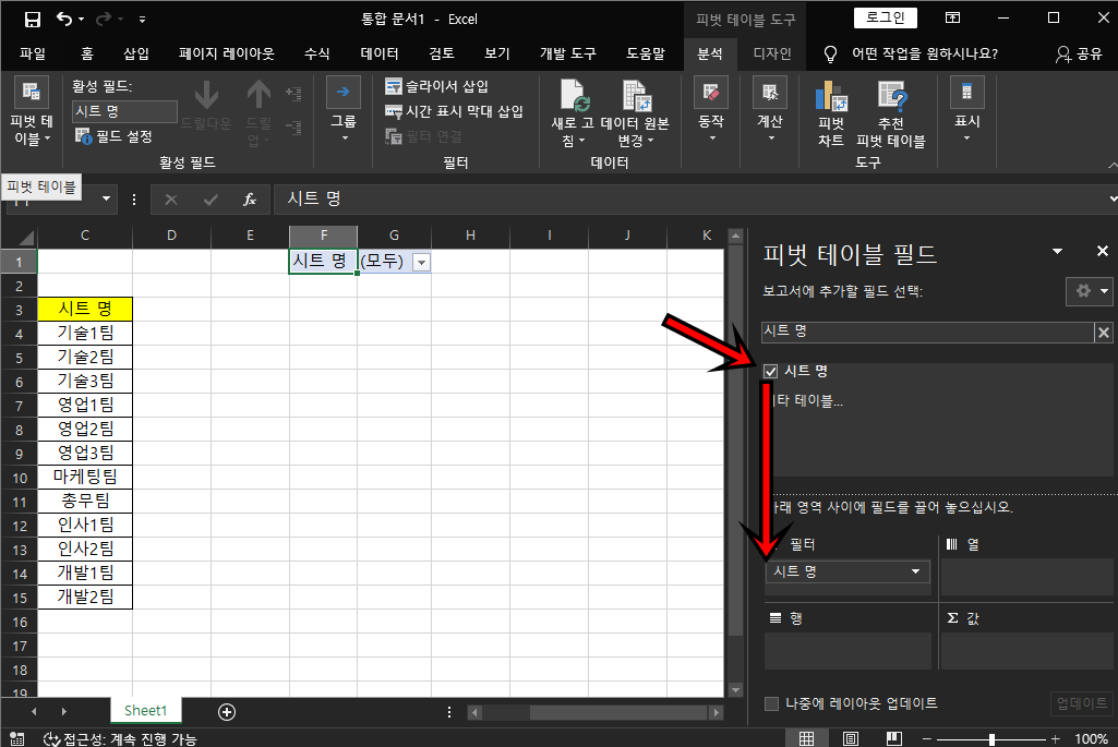 제 부서명의 제목은 "시트 명"이기에 피벗 테이블 필드에서 "시트 명"을 체크하고 마우스로 드래그해서 "필터"로 옮겨놓은 모습이에요.