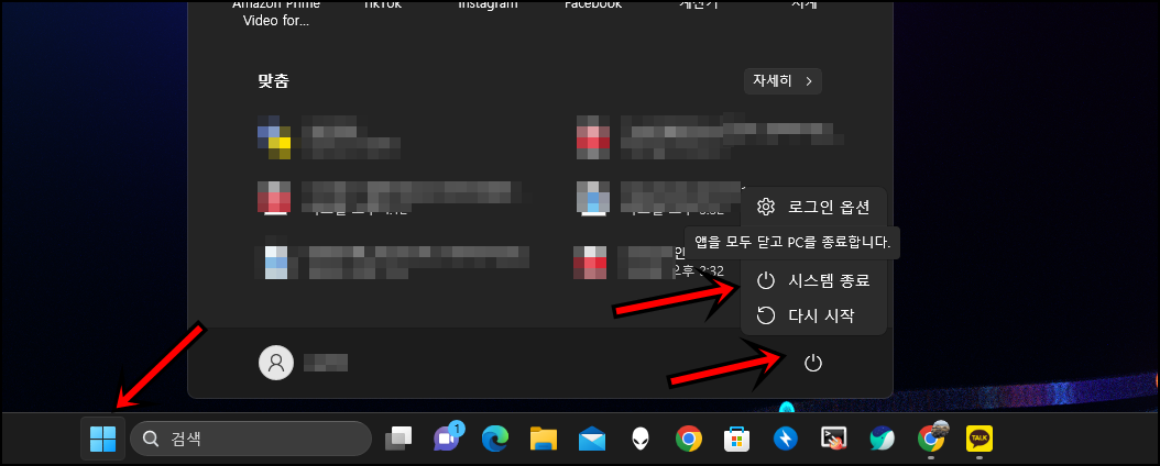 우선 모든 분들이 PC를 종료하는 방법은 시작버튼을 클릭 후 "시스템 종료"를 클릭하실 거예요. 하지만 저는 단축키와 화면을 내려서 꺼보도록 할게요.