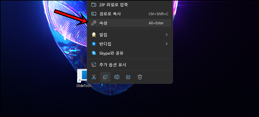 바로가기에 마우스 우클릭 후 "속성"버튼을 클릭해 주세요.