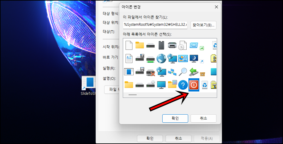 원하는 아이콘이 없는 경우 인터넷 검색을 통해 아이콘을 다운로드하셔도 되고 "아래 목록에서 아이콘 선택"에서 원하는 아이콘을 있다면 선택 후 "확인"버튼을 클릭해 주세요.